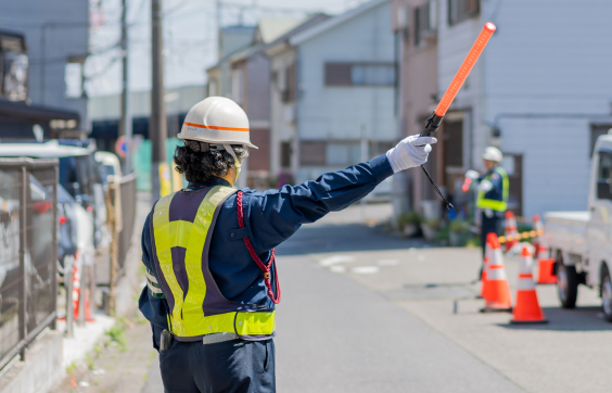 多くの人や車が行き交う道路工事や建設現場で安全に通行していただけるように交通誘導を行います。